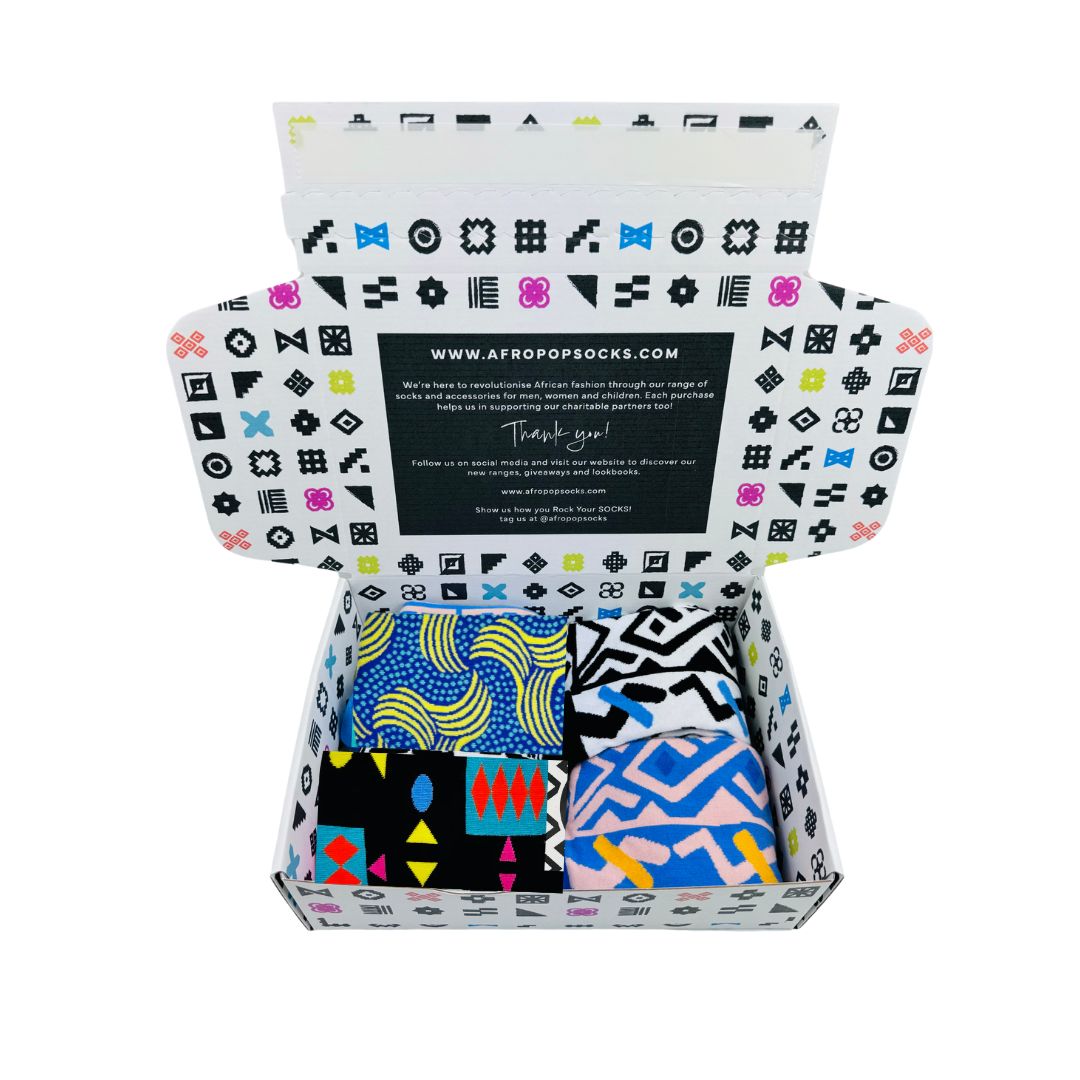 Celebrate the spirit of Central Africa with this specially curated Afropop Socks gift set inspired by the vibrant energy, artistry, and heritage of the Congo region. Featuring four unique, culturally rich designs, this box set is a bold addition to your sock collection — and the perfect gift for anyone who appreciates comfort, creativity, and African design.