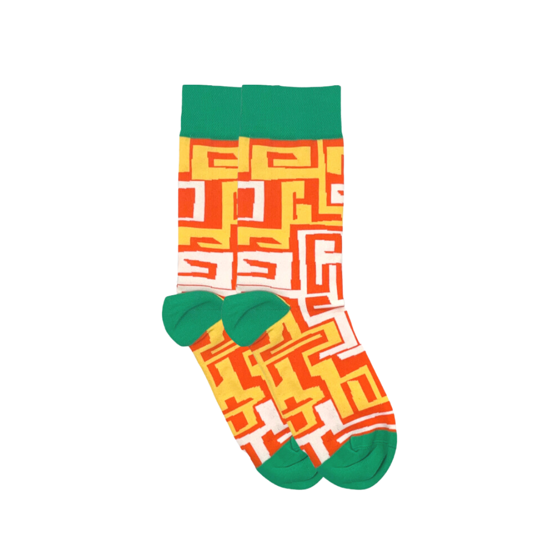 Step boldly into culture and colour with our Street Life Socks – Orange Edition. A fresh update to one of our bestselling designs, this new version features vibrant orange tones woven into a bold, geometric pattern inspired by the maze-like streets of Soweto, South Africa.